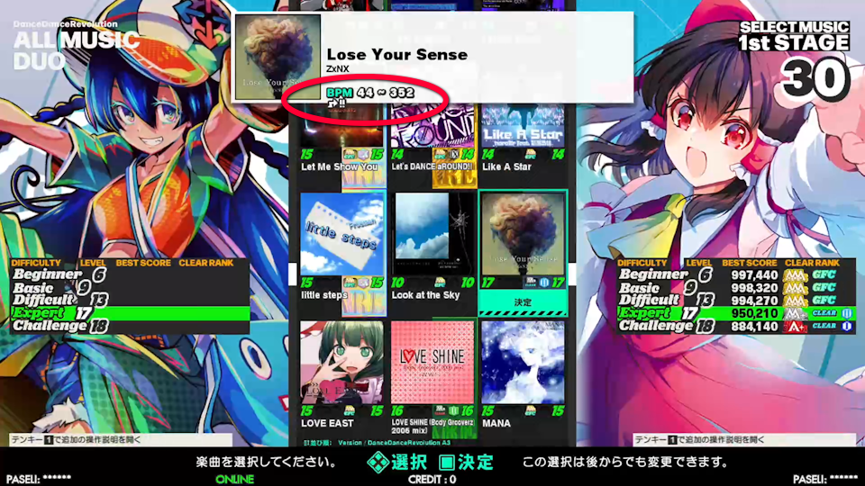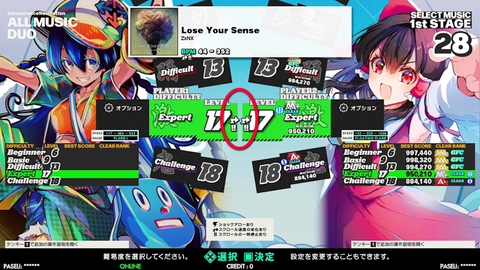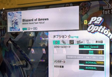 譜面が詰まって見にくいなら数字を上げる。逆に、足元がふらついたり、瞬発力で踏むような感じだったら数字を下げる、で調整していきましょう。