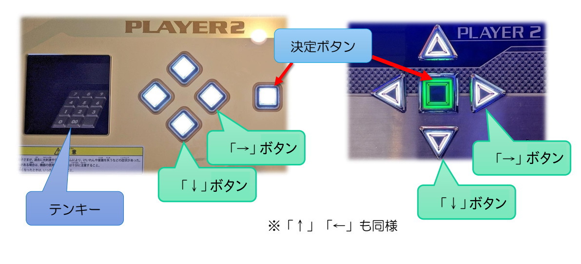 特に「↓」と「↑」は実際には手前側と奥側の配置です。画面の見かけ上「↓=左側」「↑=右側」にあるように見えますが、左右の位置は同じです。